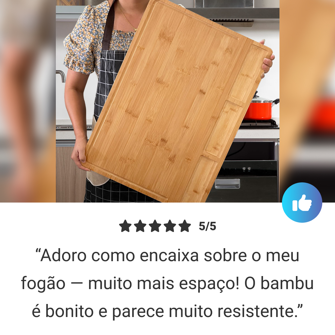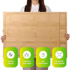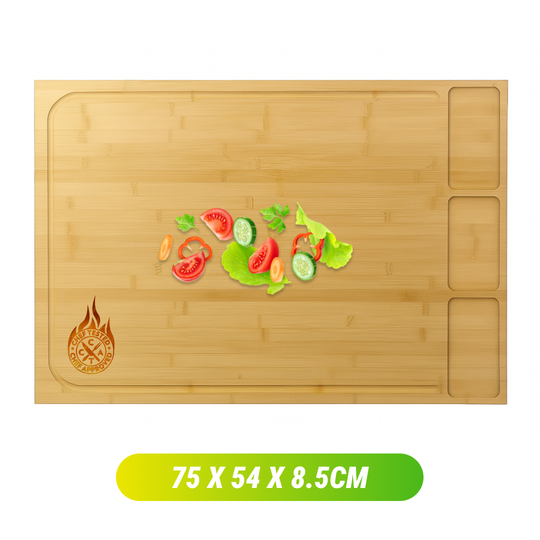 A tábua de corte extra grande BambooCraft oferece uma superfície generosa de 75 x 54 x 8.5cm, projetada para uso tradicional e para ser posicionada sobre pias ou fogões.