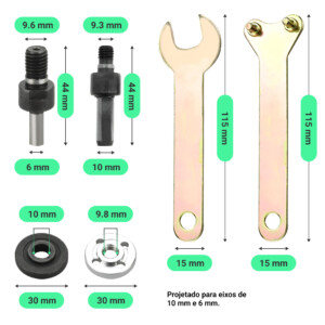 Dispositivo simples, mas eficaz. Este adaptador permite usar todos os discos abrasivos para rebarbadora angular com uma furadeira portátil. A construção é robusta e durável. O pacote inclui instruções detalhadas e as chaves adequadas para apertar rapidamente ou trocar os discos.